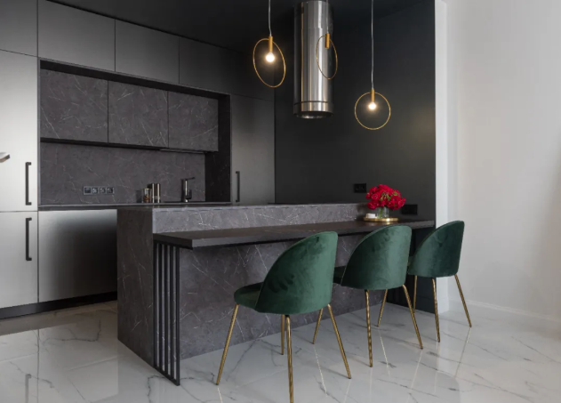 素雅簡潔的餐廚引入了充足的光線,讓整個視覺上都得以延伸,膩而豐富的紋理鋪陳,燈帶的點綴下雅加達地麵高級而優雅,成就了獨屬於空間的精致與美好。