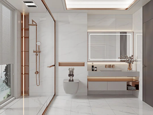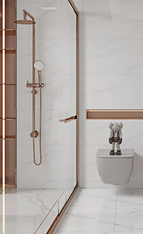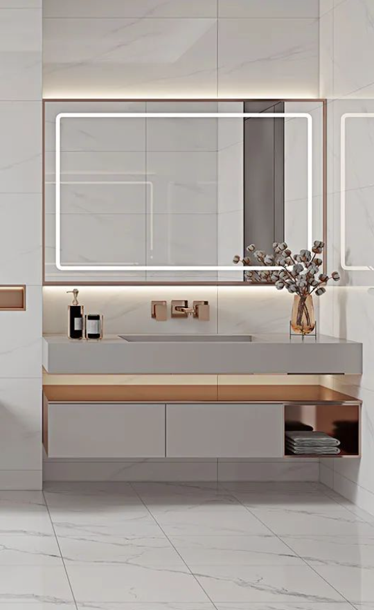 將現代工藝與自然的真實質感糅合,「哥倫比亞白」純淨素雅的磚麵靈動自然,在柔和光線下帶來波光粼粼的美感,結合玫瑰金打造的典雅洗浴櫃,煥發出非凡的氣質與底蘊。