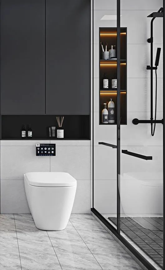 「勞特布」磚麵肌理的深淺變化,搭配黑色洗浴櫃與白色衛浴,隨意散落的石紋宛如一幅巨大的自然畫卷流淌於空間之中,把浴室變成了一個高雅的藝術世界,頗有大氣磅礴之勢。