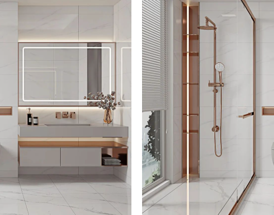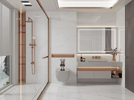 哥倫比亞白通體自帶的爽朗現代感,結合大理石紋進行通鋪,讓衛浴間格外明亮之餘,無限連紋拉伸空間視覺比例,給人一種賞心悅目的天然感受。
